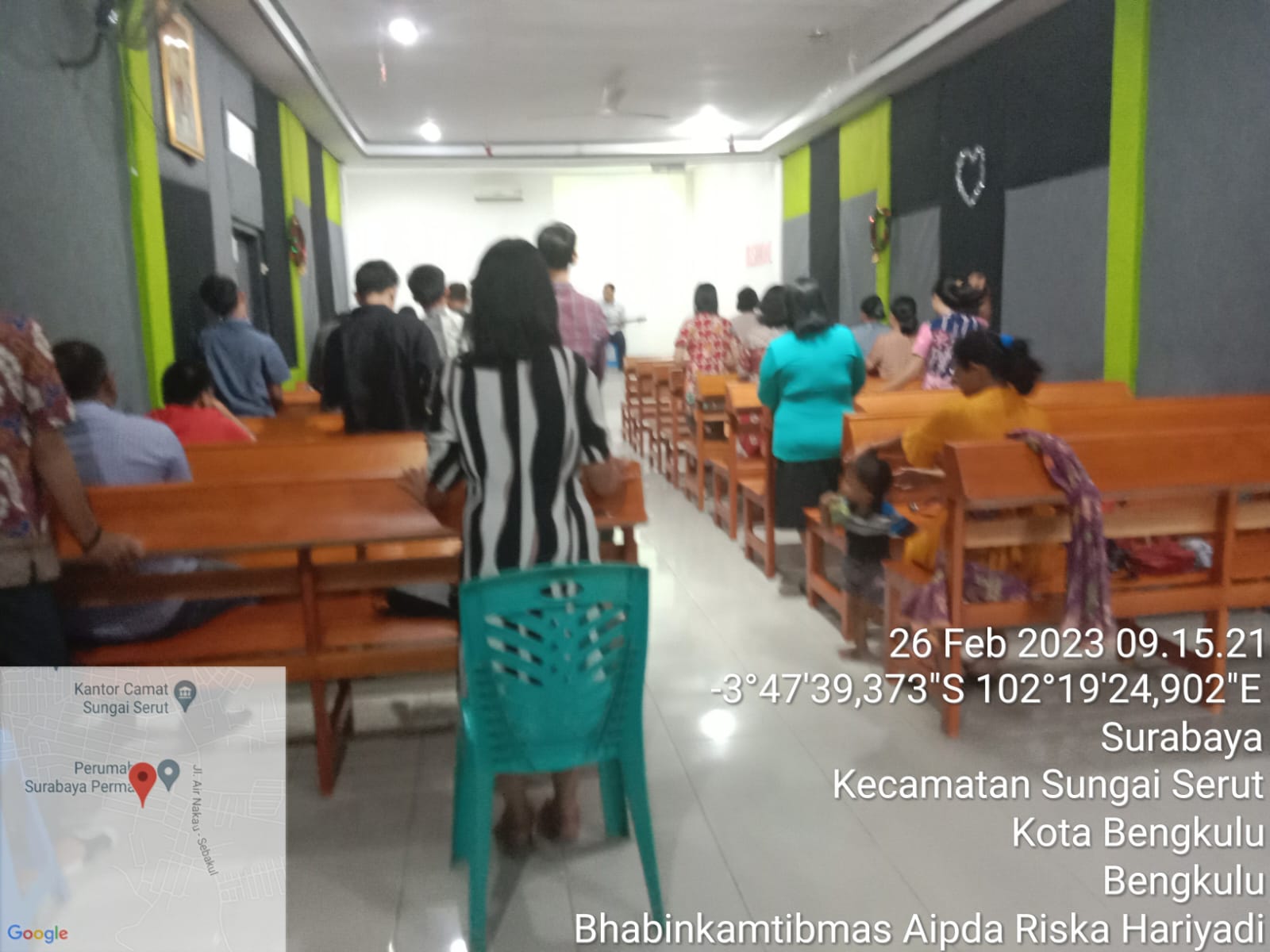 Bengkulu, Uselnews.com - Bhabinkamtibmas Polsek Teluk Segara Polresta Bengkulu Polda Bengkulu, Aipda Riska Hariyadi yang bertugas di Kelurahan Surabaya Kecamatan Sungai Serut, melaksanakan pengamanan ibadah umat Nasrani di rumah ibadah El Sahadai di Perum Surabaya Permai RT 10 Kelurahan Surabaya Kecamatan Sungai Serut Kota Bengkulu, Minggu (26/2/2023).