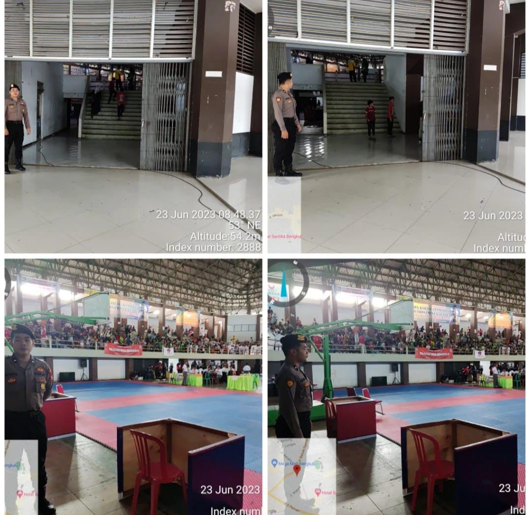 Kota Bengkulu - Guna terciptanya situasi yang aman dan kondusif selama pertandingan, Sat Samapta Polresta Bengkulu Polda Bengkulu, melakukan pengamanan kegiatan Lomba Karate-do Se-Provinsi Bengkulu di Gedung pemuda dan olahraga (GOR) Provinsi Bengkulu, Jumat (23/06/2023).