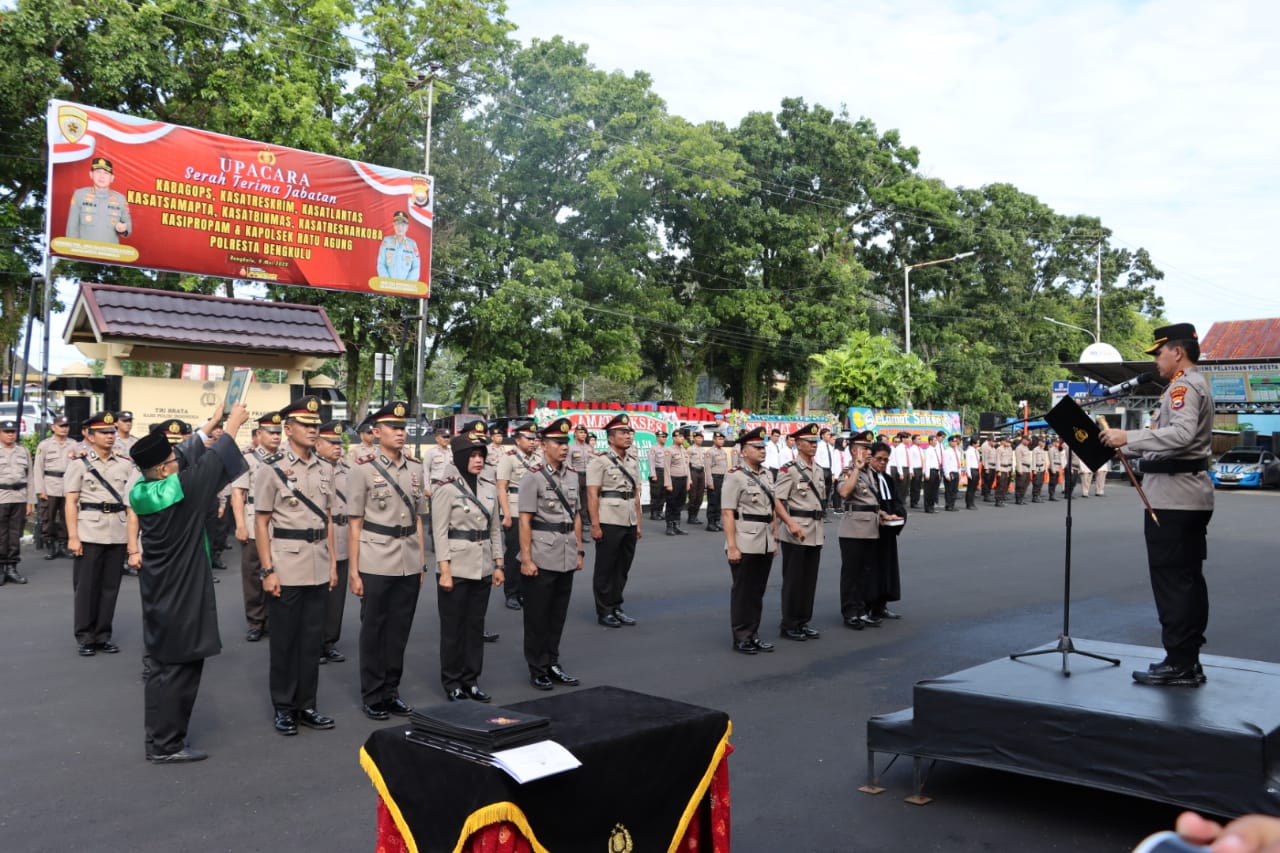 Uselnews.com - Kapolresta Bengkulu Kombes Pol Aris Sulistyono, S.H., M.H pimpin Upacara Serah Terima Jabatan Kabag Ops, Kasat Reskrim, Kasat Lantas, Kasat Samapta, Kasat Binmas, Kasat Narkoba, Kasi Propam dan Kapolsek Ratu Agung Polres Kota Bengkulu.