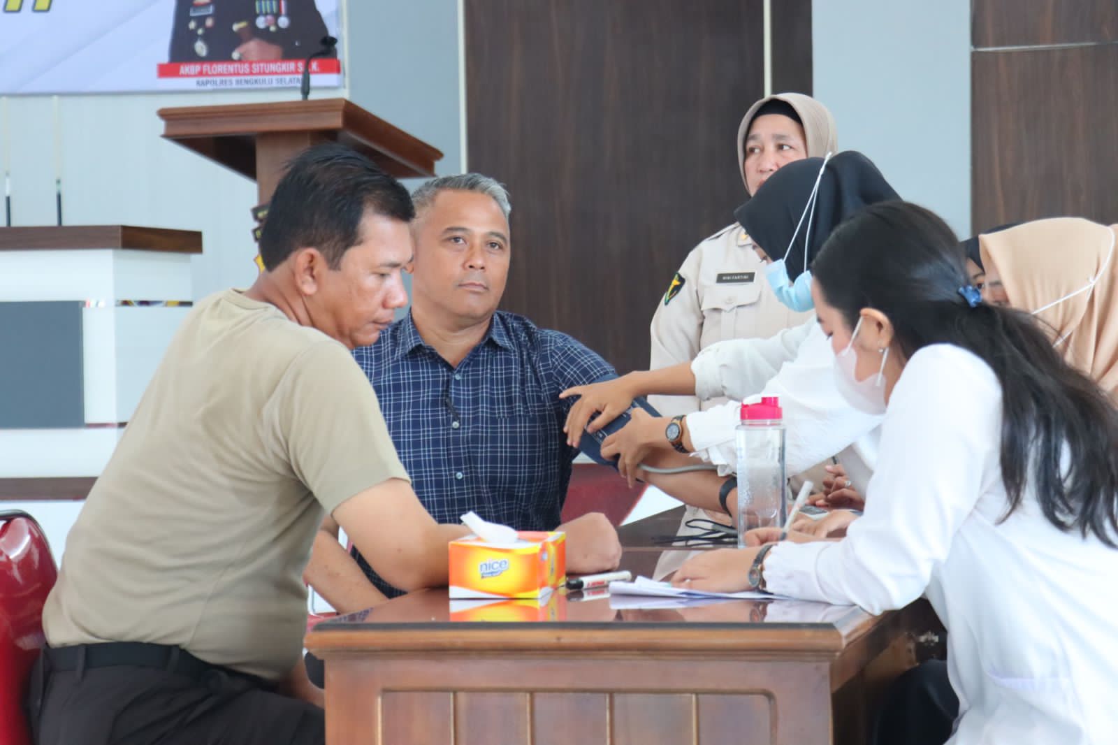 Hadir dalam giat tersebut, Kapolres Bengkulu Selatan, AKBP Florentus Situngkir S.I.K., Wakapolres Bengkulu Selatan, Para Kabag, Para Kasat, Para Kasi dan Kasubbag Polres Bengkulu Selatan serta Personel Polres Bengkulu Selatan, Polsek jajaran dan bhayangkari, Personel Sie Dokkes Polres Bengkulu Selatan, dan Petugas dari PMI Kabupaten Bengkulu Selatan.